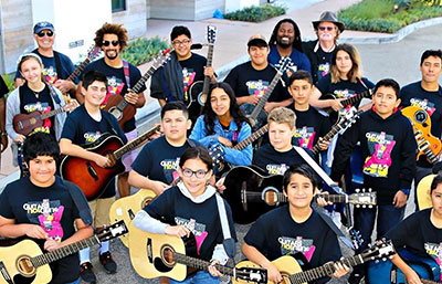 The Guitars Not Guns Band features Monterey County youth, alumni, and adult volunteers who gather every Saturday at the Marina Teen Center for free guitar lessons. Playing a blend of American classics and contemporary hits, these kids are fun and inspiring, with groovy rhythm stand out vocal and solo performers. Under the direction of Amy Warren. Guitars Not Guns provides free instruments and lessons throughout Monterey County. The band performs at local festivals and events including the West End Festival, County Fair, and First Night Monterey.